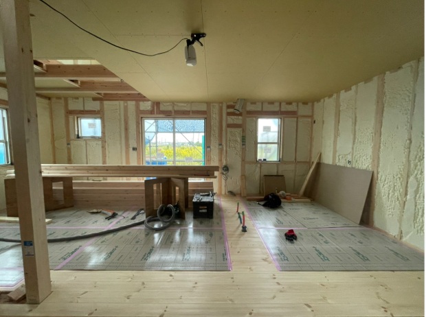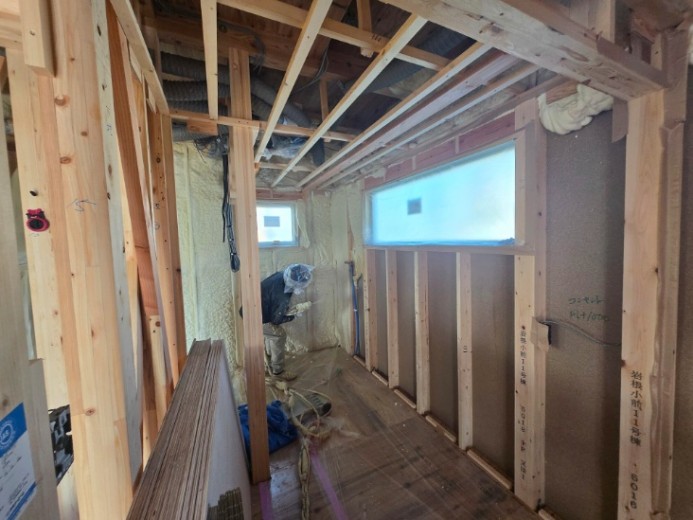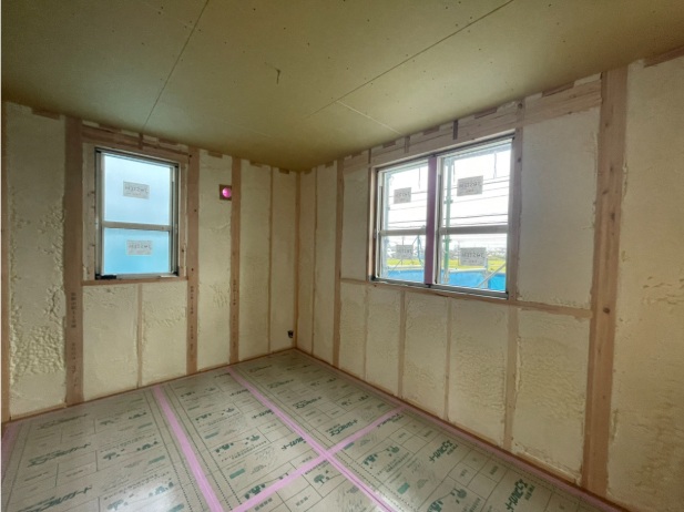 吹付断熱といい、発泡性ウレタンを霧状に吹き付けております。