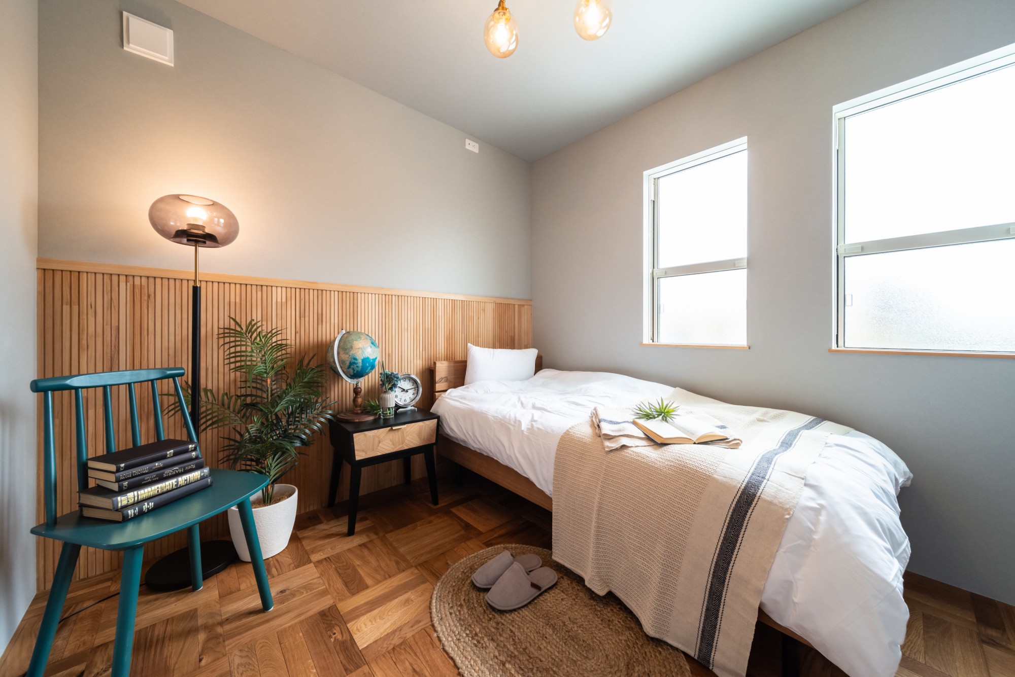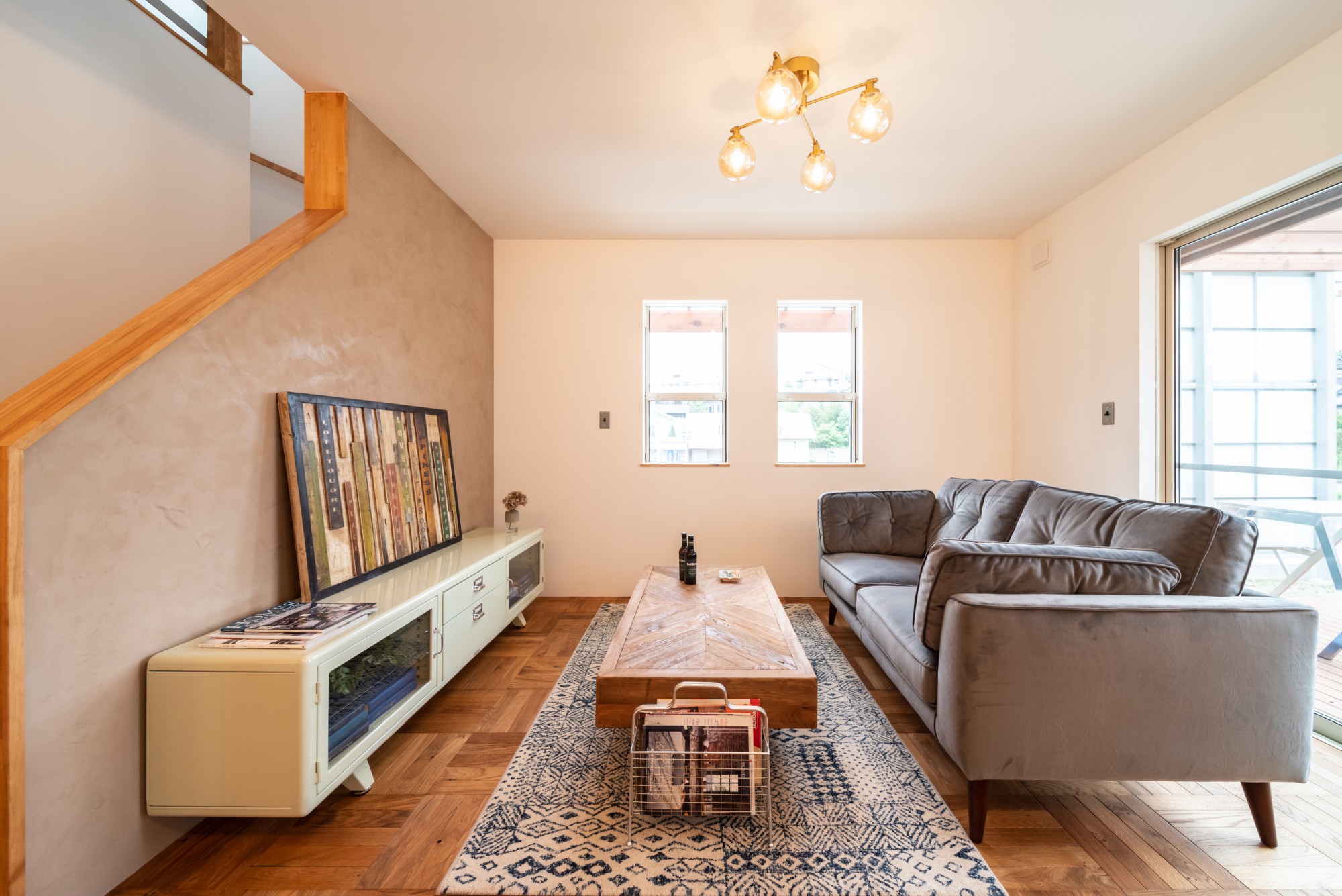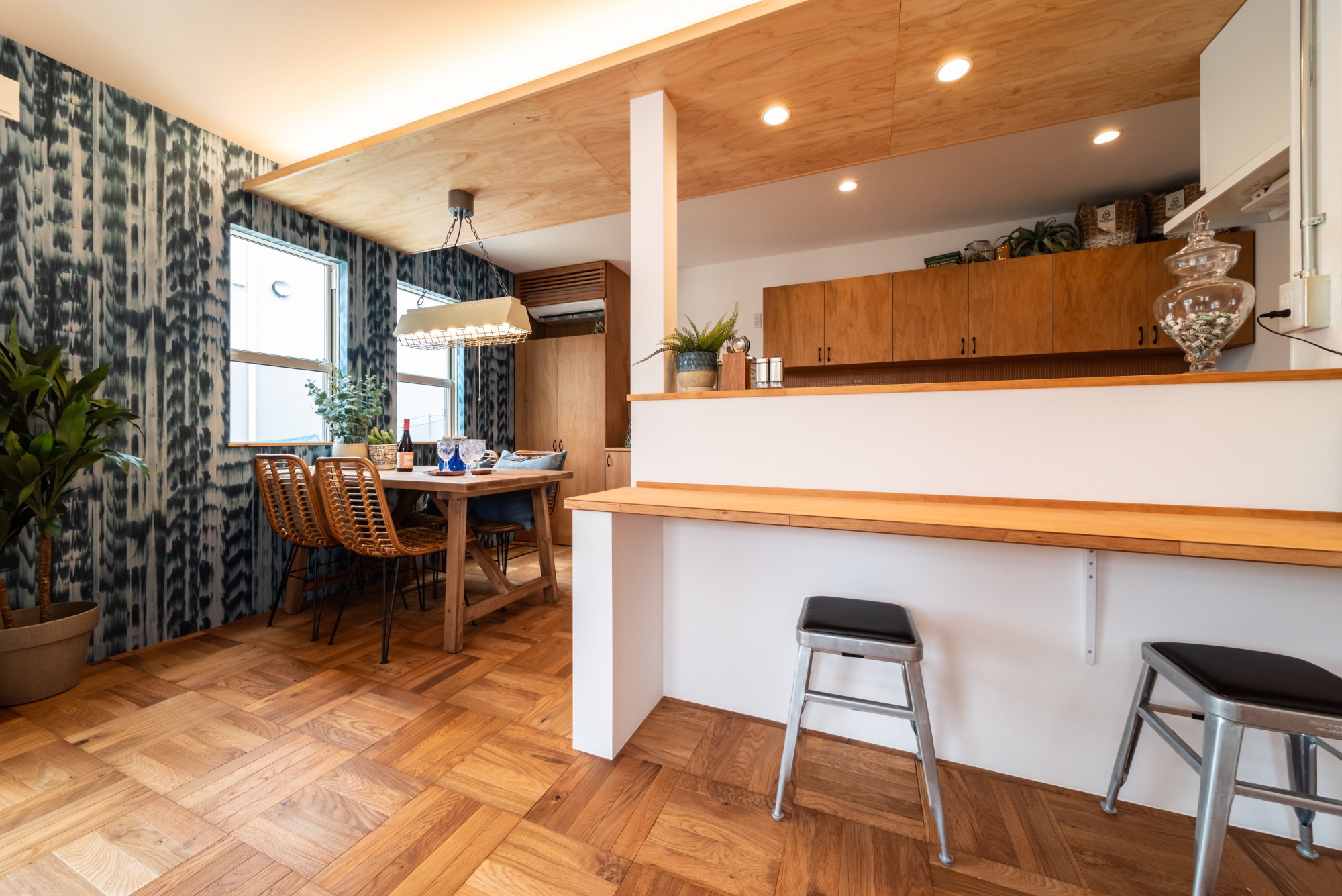 床はパーケットフロアを採用し、塗り壁や鏡面漆喰のアクセント、