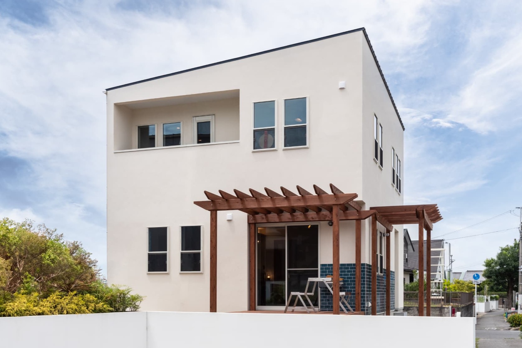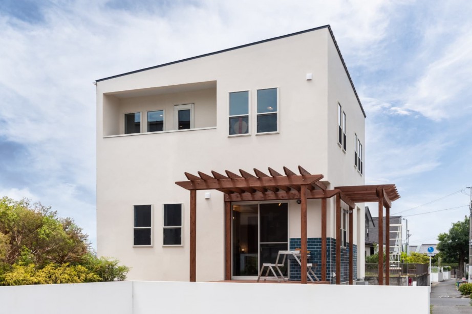 白い塗り壁と青いタイルが爽やかなCalifornia Styleのおうち。